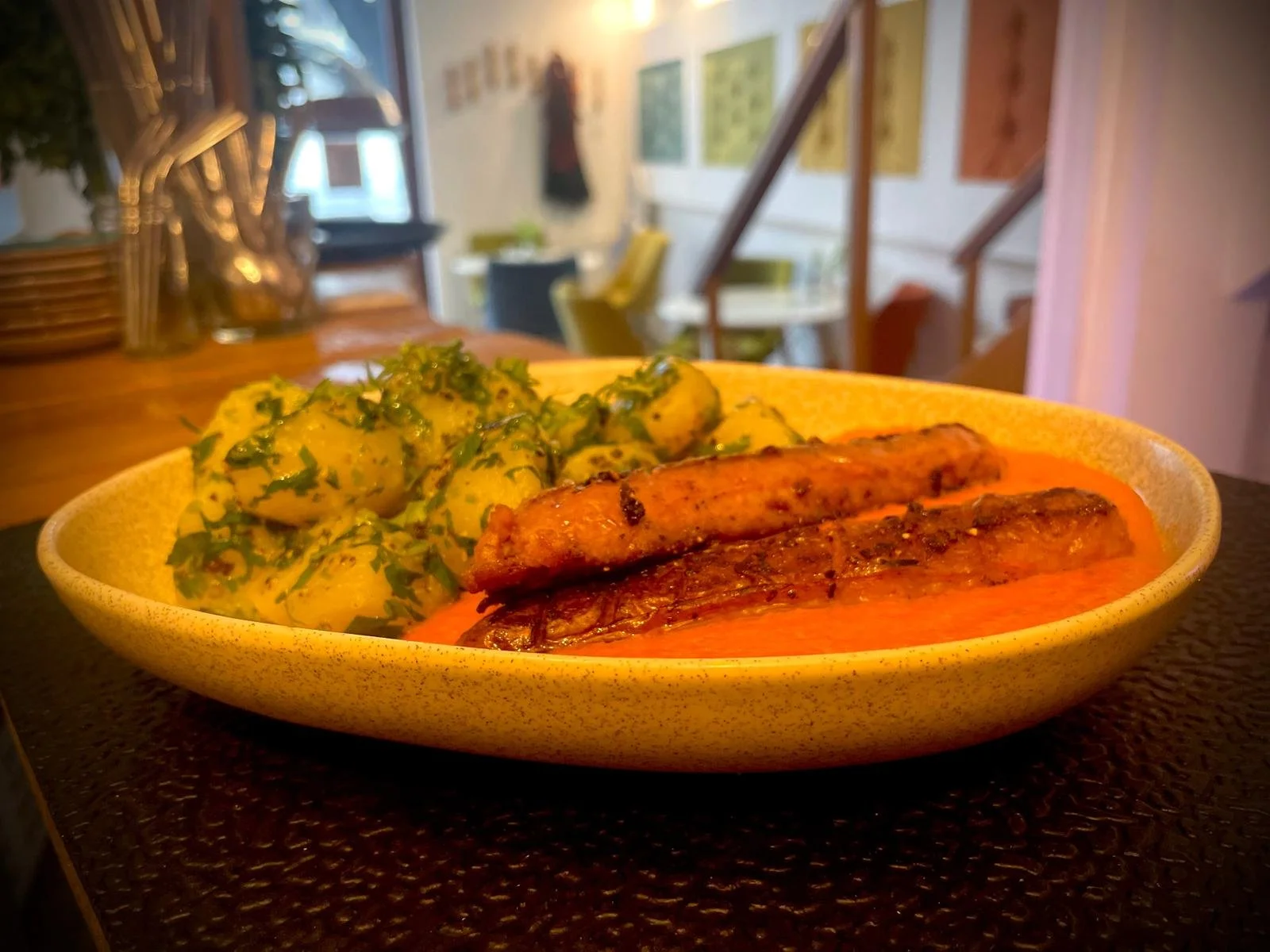 Chilli with Crispy Wheat Tortilla and Soy Yogurt. Slow-cooked, rich in vegetables, and served with a crispy tortilla. Whether you like it spicy or mild, it’s a top-tier choice in the comfort food category.