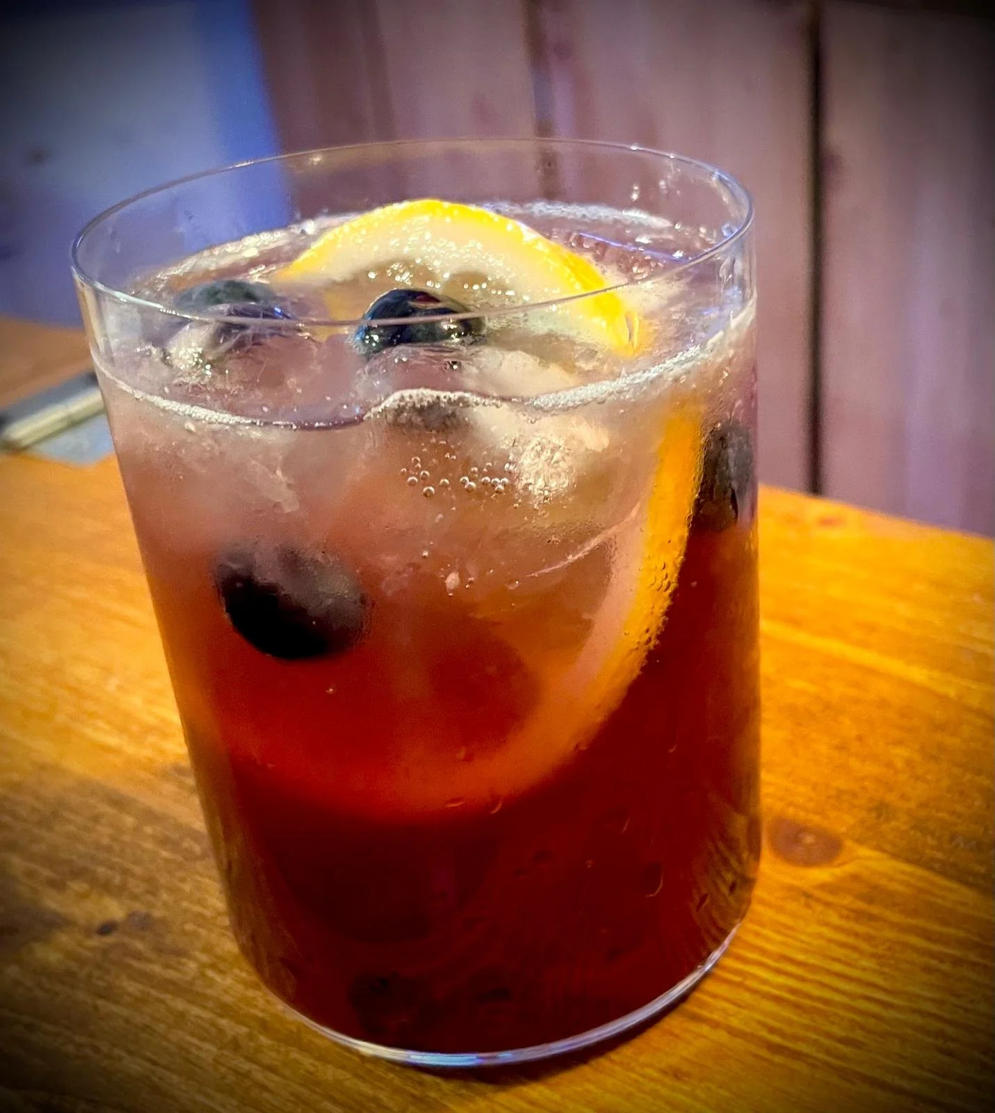 Gin, fresh de lamaie, sirop de menta, sirop de fructe de padure, apa tonica mov