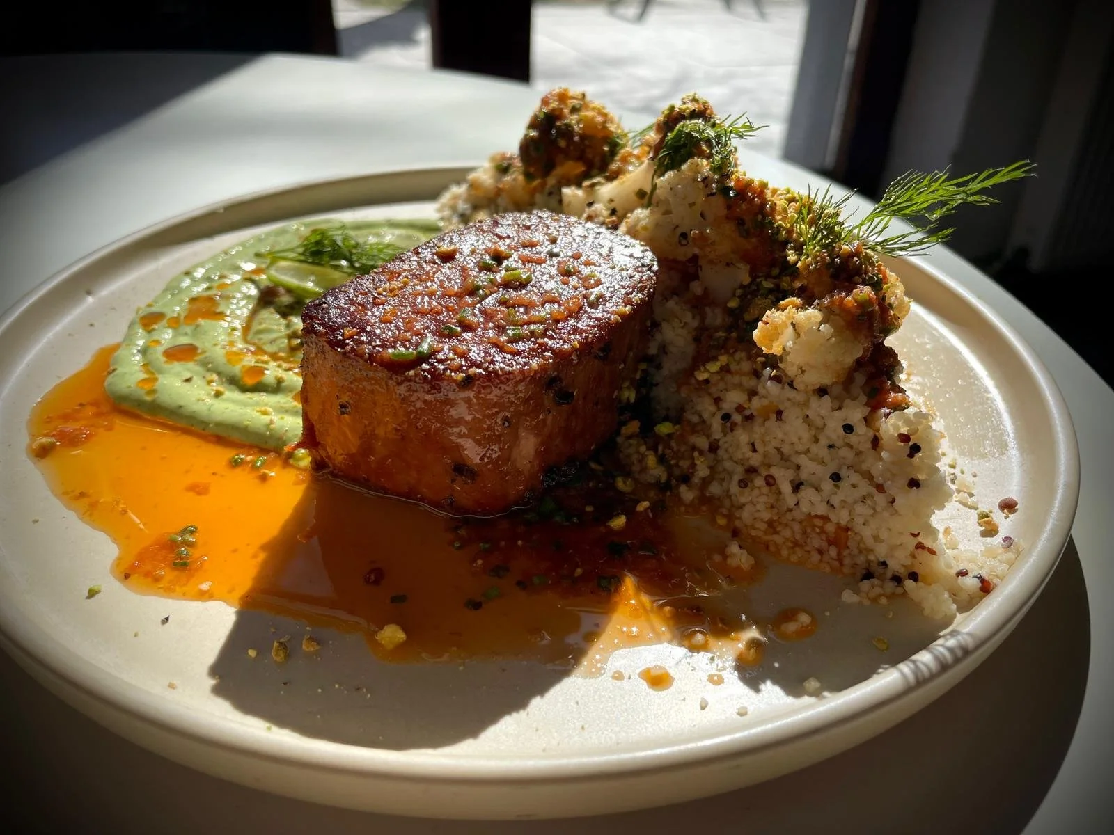 Medalion din proteina pe baza de soia, sos vegan green goddess, cuscus, quinoa, conopida, rosii uscate, caise deshidratate, avocado, crema vegana pe baza de cocos, marar, tarhon, menta, chives, patrunjel, lime, usturoi, fistic, ulei de masline, sare, piper, ulei de floarea soarelui