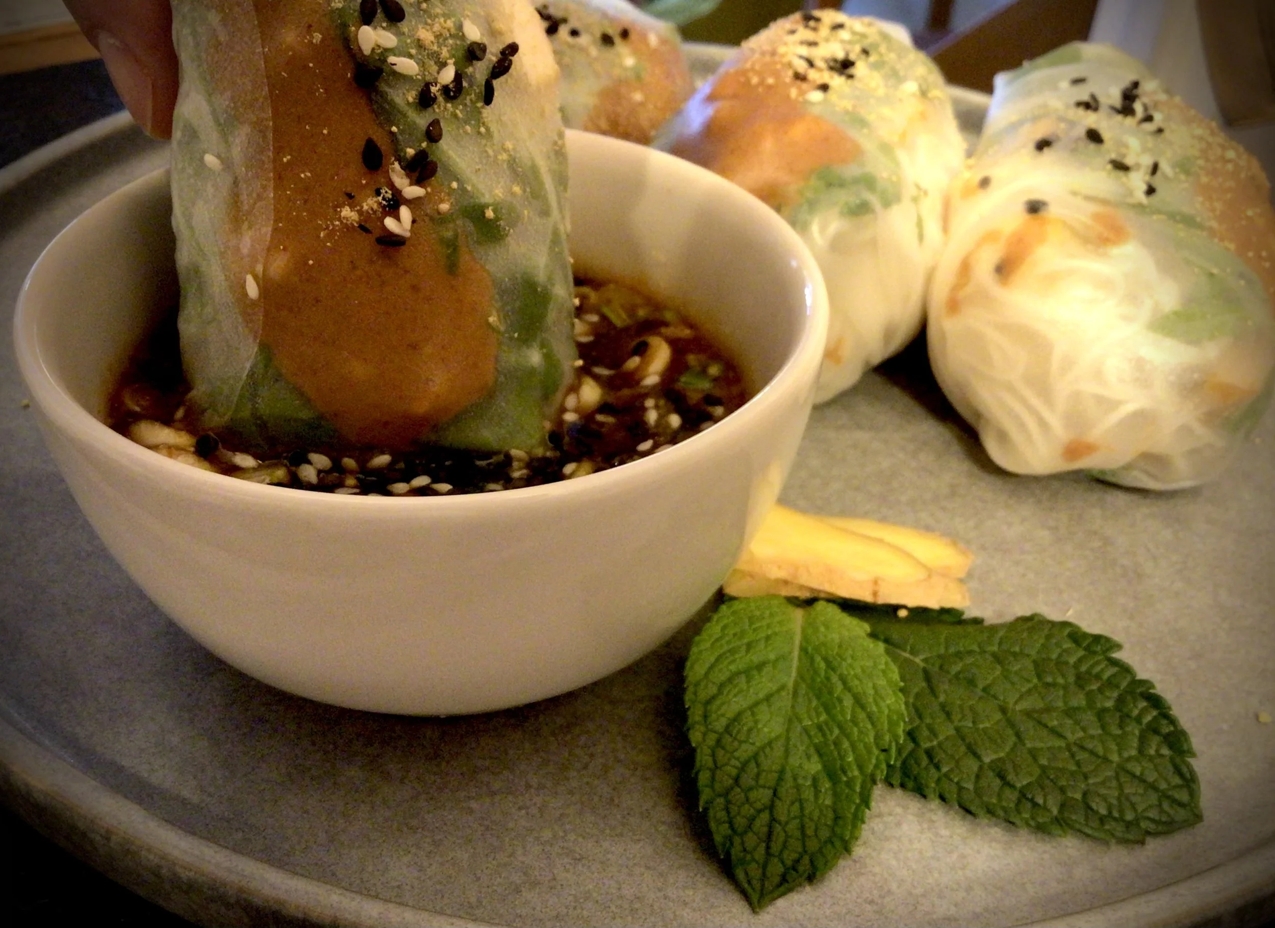 Ingrediente: Rice paper, vermicelli, unt de arahide, tofu, rodie, rucola, menta, ridiche, seminte de susan, ulei de susan, crema de avocado, sos de soia, ceapa verde, crema vegetala pe baza de cocos.