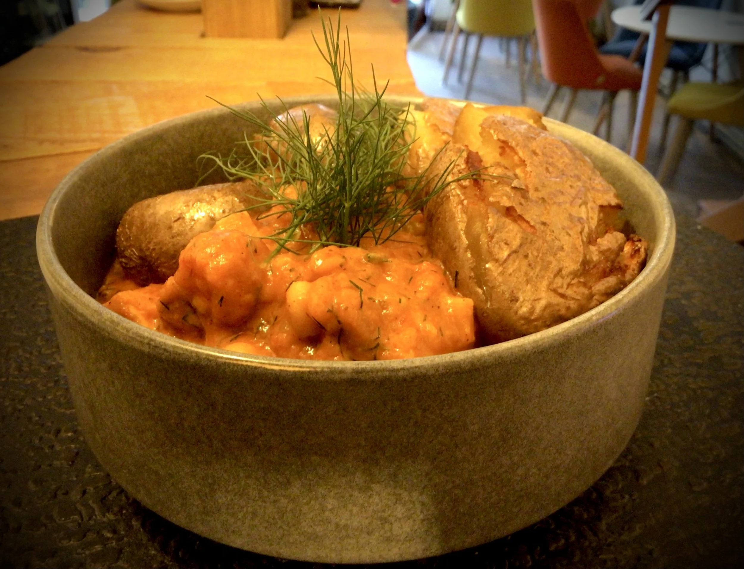 EN Ingrendients: Potatoes, cremini mushrooms, cherry tomatoes, onion, garlic, vegan butter, summer savory (Satureja hortensis), nutmeg, spring onion, coconut-based vegan cream, coconut-based vegan block.